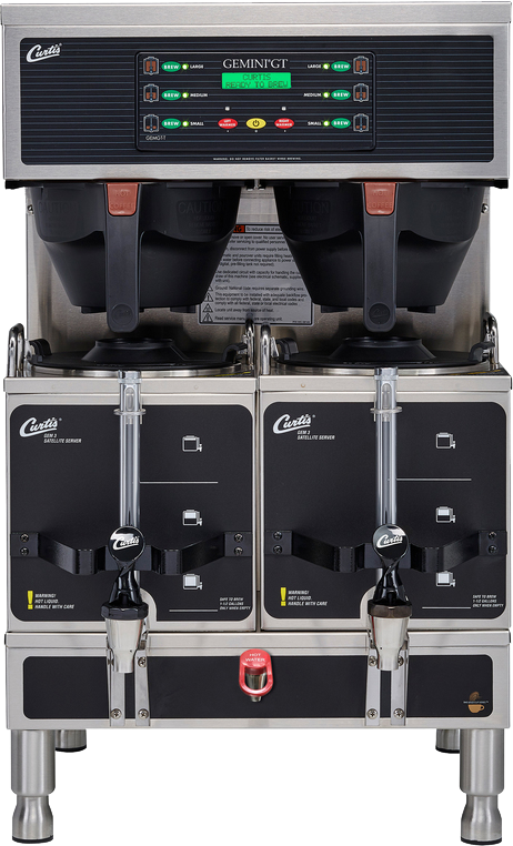 Gemini® systems are available in both single and twin, designed to optimize coffee quality and flavor, while reducing maintenance and service. The Satellite Servers maintain coffee temperature, preserving the rich and bold flavor for extended periods. On-Board self-diagnostics continually sense proper brewing operations and a Service Phone Number and error code are displayed in the event technical assistance is required.