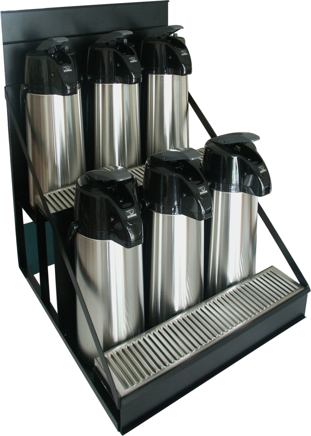 Keep your airpots organized and readily available with the Curtis CAR-2-BLK black 11 1/2″ x 13 1/4″ x 11 3/4″ six airpot rack! This rack is large enough to hold two airpots filled with your most popular coffee, and its attractive black exterior lets it blend with any area’s decor. And thanks to the included drip tray, you can be sure your countertop will stay clean throughout the day.